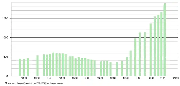 L'évolution du nombre d'habitants est connue à travers les recensements de la population effectués dans la commune depuis 1793. Pour les communes de moins de 10 000 habitants, une enquête de recensement portant sur toute la population est réalisée tous les cinq ans, les populations de référence des années intermédiaires étant quant à elles estimées par interpolation ou extrapolation[24]. Pour la commune, le premier recensement exhaustif entrant dans le cadre du nouveau dispositif a été réalisé en 2006[25].