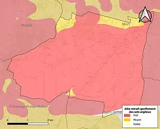 Les mouvements de terrains susceptibles de se produire sur la commune sont des tassements différentiels[19]. Le retrait-gonflement des sols argileux est susceptible d'engendrer des dommages importants aux bâtiments en cas d’alternance de périodes de sécheresse et de pluie[20]. 99 % de la superficie communale est en aléa moyen ou fort (54,9 % au niveau départemental et 48,5 % au niveau national)[Carte 2]. Depuis le , en application de la loi ELAN, différentes contraintes s'imposent aux vendeurs, maîtres d'ouvrages ou constructeurs de biens situés dans une zone classée en aléa moyen ou fort[Note 4],[21].