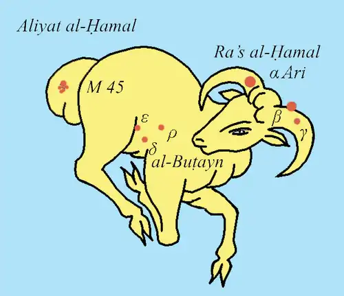 Sheratan est le nom approuvé pour β Ari par l’Union astronomique internationale. (UAI)[2]. c'est l'arabe الشرطان al-Šaraṭān, littéralement « les Deux Marques [de l’entrée de l’équinoxe] », qui s'applique, dans les calendriers arabes traditionnels, au groupe βγ Ari et correspond au point vernal au début de notre ère[3],[4].