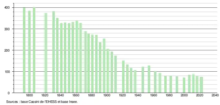 L'évolution du nombre d'habitants est connue à travers les recensements de la population effectués dans la commune depuis 1793. Pour les communes de moins de 10 000 habitants, une enquête de recensement portant sur toute la population est réalisée tous les cinq ans, les populations de référence des années intermédiaires étant quant à elles estimées par interpolation ou extrapolation[34]. Pour la commune, le premier recensement exhaustif entrant dans le cadre du nouveau dispositif a été réalisé en 2006[35].