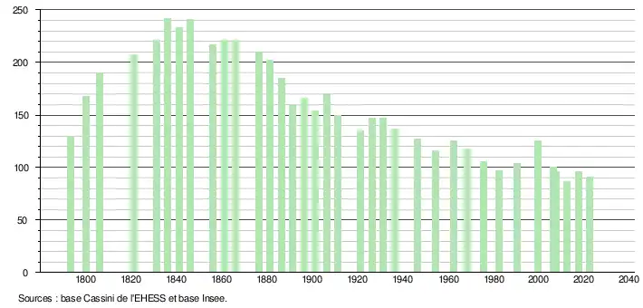 L'évolution du nombre d'habitants est connue à travers les recensements de la population effectués dans la commune depuis 1793. Pour les communes de moins de 10 000 habitants, une enquête de recensement portant sur toute la population est réalisée tous les cinq ans, les populations de référence des années intermédiaires étant quant à elles estimées par interpolation ou extrapolation[21]. Pour la commune, le premier recensement exhaustif entrant dans le cadre du nouveau dispositif a été réalisé en 2007[22].