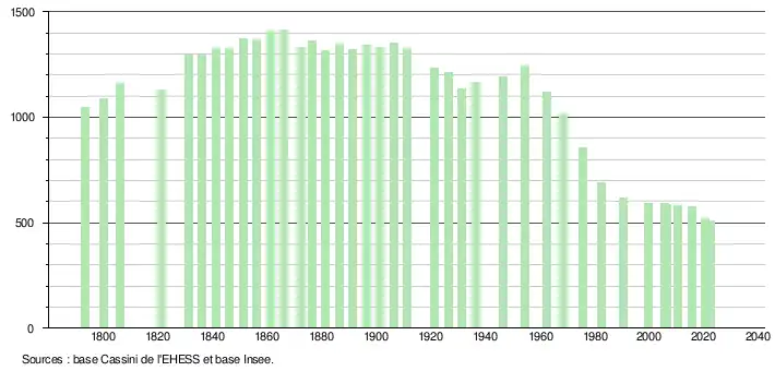 L'évolution du nombre d'habitants est connue à travers les recensements de la population effectués dans la commune depuis 1793. Pour les communes de moins de 10 000 habitants, une enquête de recensement portant sur toute la population est réalisée tous les cinq ans, les populations de référence des années intermédiaires étant quant à elles estimées par interpolation ou extrapolation[29]. Pour la commune, le premier recensement exhaustif entrant dans le cadre du nouveau dispositif a été réalisé en 2005[30].