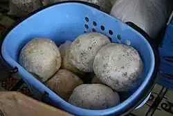 La pâte épaisse obtenue va être mélangée à de l’eau et vigoureusement barattée. La pâte obtenue est brassée avec de longues spatules, tandis que le mélange chauffe.