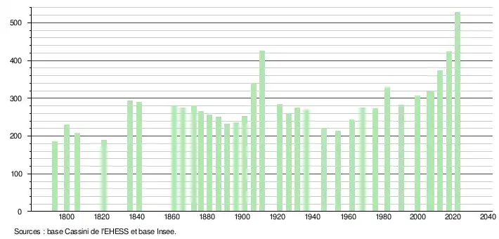 L'évolution du nombre d'habitants est connue à travers les recensements de la population effectués dans la commune depuis 1793. Pour les communes de moins de 10 000 habitants, une enquête de recensement portant sur toute la population est réalisée tous les cinq ans, les populations de référence des années intermédiaires étant quant à elles estimées par interpolation ou extrapolation[21]. Pour la commune, le premier recensement exhaustif entrant dans le cadre du nouveau dispositif a été réalisé en 2007[22].