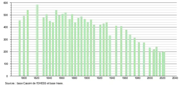L'évolution du nombre d'habitants est connue à travers les recensements de la population effectués dans la commune depuis 1793. Pour les communes de moins de 10 000 habitants, une enquête de recensement portant sur toute la population est réalisée tous les cinq ans, les populations de référence des années intermédiaires étant quant à elles estimées par interpolation ou extrapolation[25]. Pour la commune, le premier recensement exhaustif entrant dans le cadre du nouveau dispositif a été réalisé en 2005[26].