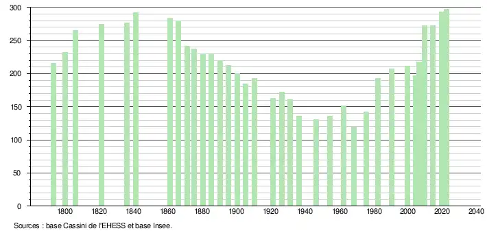 L'évolution du nombre d'habitants est connue à travers les recensements de la population effectués dans la commune depuis 1793. Pour les communes de moins de 10 000 habitants, une enquête de recensement portant sur toute la population est réalisée tous les cinq ans, les populations de référence des années intermédiaires étant quant à elles estimées par interpolation ou extrapolation[15]. Pour la commune, le premier recensement exhaustif entrant dans le cadre du nouveau dispositif a été réalisé en 2004[16].