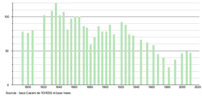 - ↑ Dans le tableau des recensements et le graphique, par convention dans Wikipédia, le principe a été retenu, pour les populations légales postérieures à 1999 de n’afficher dans le tableau des recensements et le graphique que les populations correspondant à l'année 2006, première population légale publiée calculée conformément aux concepts définis dans le décret no 2003-485 du 5 juin 2003, et les années correspondant à une enquête exhaustive de recensement pour les communes de moins de 10 000 habitants, ainsi que la dernière population légale publiée par l’Insee.