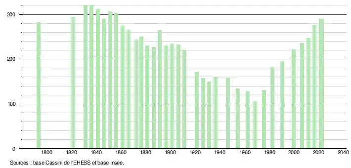 L'évolution du nombre d'habitants est connue à travers les recensements de la population effectués dans la commune depuis 1793. Pour les communes de moins de 10 000 habitants, une enquête de recensement portant sur toute la population est réalisée tous les cinq ans, les populations de référence des années intermédiaires étant quant à elles estimées par interpolation ou extrapolation[24]. Pour la commune, le premier recensement exhaustif entrant dans le cadre du nouveau dispositif a été réalisé en 2006[25].