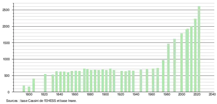 | L'évolution du nombre d'habitants est connue à travers les recensements de la population effectués dans la commune depuis 1793. Pour les communes de moins de 10 000 habitants, une enquête de recensement portant sur toute la population est réalisée tous les cinq ans, les populations de référence des années intermédiaires étant quant à elles estimées par interpolation ou extrapolation[29]. Pour la commune, le premier recensement exhaustif entrant dans le cadre du nouveau dispositif a été réalisé en 2007[30]. En 2022, la commune comptait 2 608 habitants[Note 7], en évolution de +18,87 % par rapport à 2016 (Gironde : +6,91 %, France hors Mayotte : +2,11 %). |