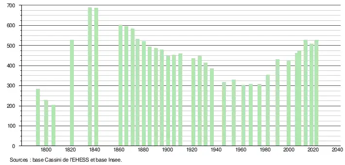 L'évolution du nombre d'habitants est connue à travers les recensements de la population effectués dans la commune depuis 1793. Pour les communes de moins de 10 000 habitants, une enquête de recensement portant sur toute la population est réalisée tous les cinq ans, les populations de référence des années intermédiaires étant quant à elles estimées par interpolation ou extrapolation[20]. Pour la commune, le premier recensement exhaustif entrant dans le cadre du nouveau dispositif a été réalisé en 2008[21].