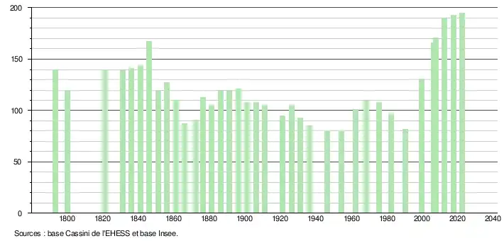 L'évolution du nombre d'habitants est connue à travers les recensements de la population effectués dans la commune depuis 1793. Pour les communes de moins de 10 000 habitants, une enquête de recensement portant sur toute la population est réalisée tous les cinq ans, les populations de référence des années intermédiaires étant quant à elles estimées par interpolation ou extrapolation[39]. Pour la commune, le premier recensement exhaustif entrant dans le cadre du nouveau dispositif a été réalisé en 2007[40].