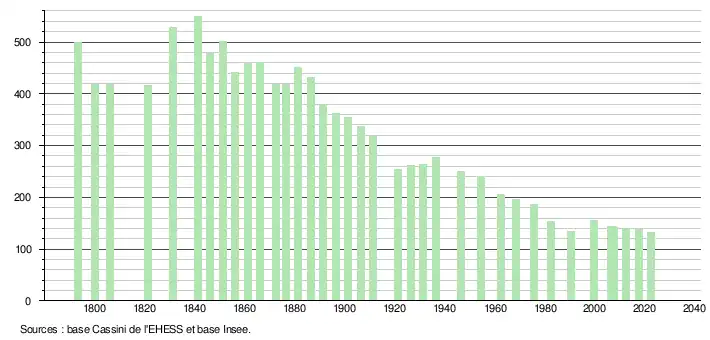L'évolution du nombre d'habitants est connue à travers les recensements de la population effectués dans la commune depuis 1793. Pour les communes de moins de 10 000 habitants, une enquête de recensement portant sur toute la population est réalisée tous les cinq ans, les populations de référence des années intermédiaires étant quant à elles estimées par interpolation ou extrapolation[23]. Pour la commune, le premier recensement exhaustif entrant dans le cadre du nouveau dispositif a été réalisé en 2007[24].