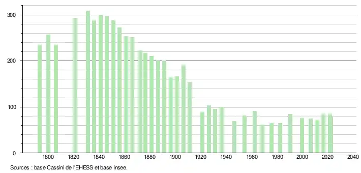 L'évolution du nombre d'habitants est connue à travers les recensements de la population effectués dans la commune depuis 1793. Pour les communes de moins de 10 000 habitants, une enquête de recensement portant sur toute la population est réalisée tous les cinq ans, les populations de référence des années intermédiaires étant quant à elles estimées par interpolation ou extrapolation[22]. Pour la commune, le premier recensement exhaustif entrant dans le cadre du nouveau dispositif a été réalisé en 2006[23].