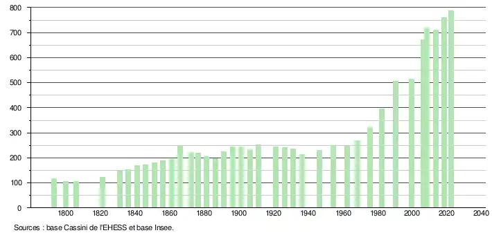 L'évolution du nombre d'habitants est connue à travers les recensements de la population effectués dans la commune depuis 1793. Pour les communes de moins de 10 000 habitants, une enquête de recensement portant sur toute la population est réalisée tous les cinq ans, les populations de référence des années intermédiaires étant quant à elles estimées par interpolation ou extrapolation[49]. Pour la commune, le premier recensement exhaustif entrant dans le cadre du nouveau dispositif a été réalisé en 2008[50].