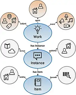 Le modèle BIBFRAME se compose de trois entités principales contenant chacune des informations bibliographiques différentes :