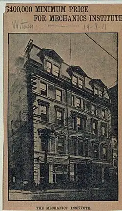 Le Mechanics' Institute of Montreal[10]ou Mechanics Institute of Montreal[11] est mis sur pied en 1840. Il reprend les activités dans la foulée de l’organisme fondé en 1828, avec John Redpath à sa tête[11]. Les hommes seulement sont admis jusqu’en 1843, date à laquelle l’établissement devient mixte [12]. On dénombre 280 personnes après l’arrivée de femmes[13] et la classe moyenne représente une forte proportion des usagers. Moins de conférences ont lieu en 1851. La School of Arts and Design donne les cours du soir auparavant offerts à l’institut[12]. En 1855, le Mechanics’ institute of Montreal se transporte rue Saint-Jacques[14]. La salle des Artisans offre des concerts. Parmi les artistes de marque, on retrouve l’Orchestre symphonique de Montréal, le Mendelssohn Choir et Calixa Lavallée [15],[16]. 738 personnes sont abonnées et ont accès à 1500 documents à cette époque [14]. Une tentative d’expansion à Pointe-Saint Charles se solde par un échec [14]. Pour mieux se rapprocher des milieux de vie, l’institut quitte la rue Saint-Jacques et se dote d’une bâtisse neuve sur la rue Atwater[11],[17]. En 1920 s’achève le projet du nouveau bâtiment[11]. Les responsables s’inspirent des bibliothèques américaines [17]. Au tournant des années 30, 1162 individus se prévalent des services du Mechanic’s Institute of Montréal[18]. Celui-ci comprend plus de 36 896 ouvrages[18].