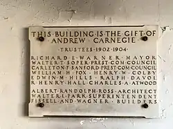 Les bibliothèques de Carnegie ont été construites entre les années 1881 et 1917 et la première fut ouverte en 1883 en Écosse[9] ; l’année 1917 marque la fin des subventions pour la construction des bibliothèques publiques de Carnegie.