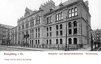 L'institution est devenue la bibliothèque d'État et universitaire (Staats und Universitätsbibliothek) après l'abdication de la maison de Hohenzollern en 1918. Kuhnert a publié une histoire de la bibliothèque en 1926[17]. D'autres collections affiliées à la bibliothèque étaient celles de l'Observatoire de Königsberg[18] et de la Handbibliothek à l'usage des étudiants.