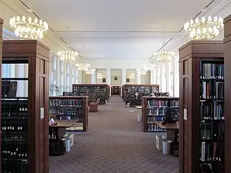 En 1915 est inaugurée la bibliothèque Widener, au sud de Harvard Yard. L'immeuble de style Beaux-Arts d'environ 30 000 m2[8] abrite environ 91 km[9] d'étagères à livres et 3,5 millions de volumes. Elle constitue aujourd'hui le principal bâtiment de la bibliothèque de l'université.