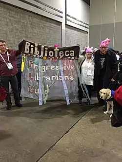 Le groupe américain Progressive Librarians Guild, fondé en 1990 et évoluant en marge de la American Library Association[14], fait partie des acteurs importants de ce mouvement décrit par Toni Samek. Ce groupe considère la bibliothéconomie « comme une profession et une pratique qui permettent de créer et d'accéder à une multitude de formes d'expression, d'expériences et d'aspirations humaines, mais reconnaît également que les bibliothèques sont des lieux où les systèmes d'injustice, d'exploitation, de contrôle et d'oppression sont nourries, normalisées et perpétuées »(traduction libre)[4]. Le but de la Progressive Librarians Guild est de « dénoncer la complicité des bibliothèques envers ces systèmes et de proposer des pratiques alternatives permettant de donner une visibilité à ceux qui sont exclus des positions de pouvoirs et/ou non-représentés dans la société et de développer une praxis qui contribue à la défense des droits humains et de la dignité humaine » (traduction libre)[4].