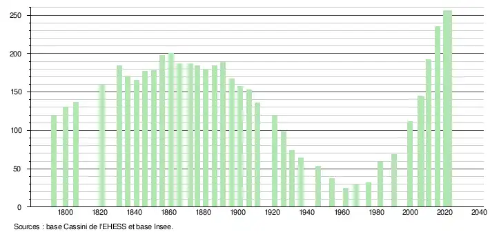 L'évolution du nombre d'habitants est connue à travers les recensements de la population effectués dans la commune depuis 1793. Pour les communes de moins de 10 000 habitants, une enquête de recensement portant sur toute la population est réalisée tous les cinq ans, les populations de référence des années intermédiaires étant quant à elles estimées par interpolation ou extrapolation[17]. Pour la commune, le premier recensement exhaustif entrant dans le cadre du nouveau dispositif a été réalisé en 2005[18].