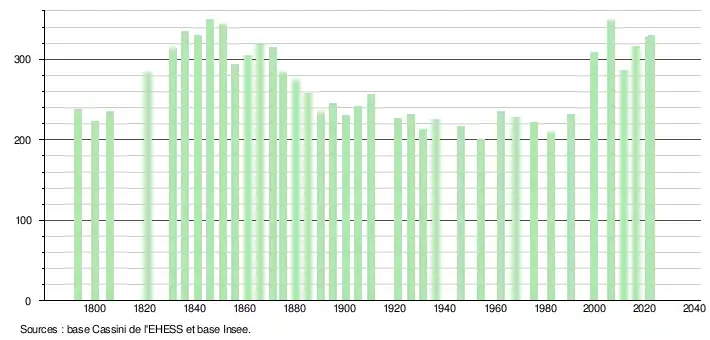 L'évolution du nombre d'habitants est connue à travers les recensements de la population effectués dans la commune depuis 1793. Pour les communes de moins de 10 000 habitants, une enquête de recensement portant sur toute la population est réalisée tous les cinq ans, les populations de référence des années intermédiaires étant quant à elles estimées par interpolation ou extrapolation[15]. Pour la commune, le premier recensement exhaustif entrant dans le cadre du nouveau dispositif a été réalisé en 2006[16].