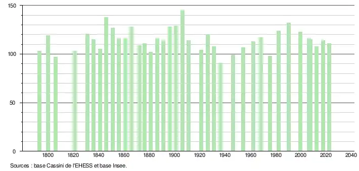 L'évolution du nombre d'habitants est connue à travers les recensements de la population effectués dans la commune depuis 1793. Pour les communes de moins de 10 000 habitants, une enquête de recensement portant sur toute la population est réalisée tous les cinq ans, les populations de référence des années intermédiaires étant quant à elles estimées par interpolation ou extrapolation[17]. Pour la commune, le premier recensement exhaustif entrant dans le cadre du nouveau dispositif a été réalisé en 2007[18].
