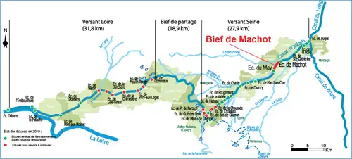 Le bief de Machot s’étend sur une longueur de 2 810 m entre l’écluse du May en amont et l’écluse de Machot en aval[A 10]. Il est entièrement situé sur la commune de Saint-Maurice-sur-Fessard.