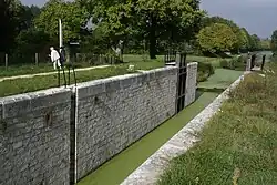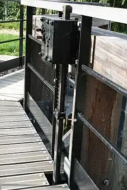 - le remplacement des portes amont et aval par des vantaux équipés de vantelles et de crics de manœuvre manuels. Les portes sont manœuvrées par des balanciers. Il n’y a pas de cric ou de crémaillère sur les bajoyers ;