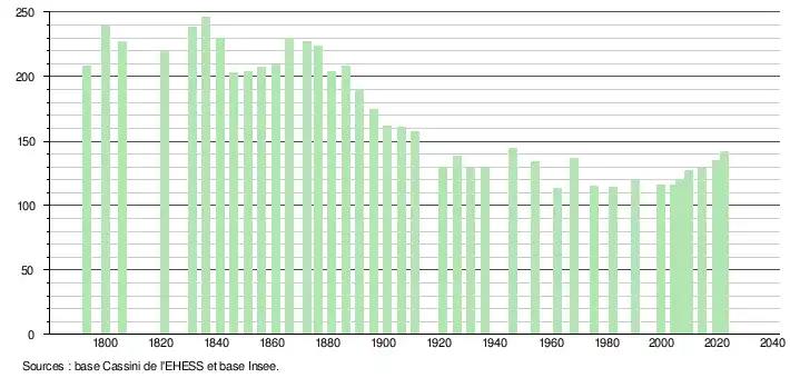 L'évolution du nombre d'habitants est connue à travers les recensements de la population effectués dans la commune depuis 1793. Pour les communes de moins de 10 000 habitants, une enquête de recensement portant sur toute la population est réalisée tous les cinq ans, les populations de référence des années intermédiaires étant quant à elles estimées par interpolation ou extrapolation[24]. Pour la commune, le premier recensement exhaustif entrant dans le cadre du nouveau dispositif a été réalisé en 2004[25].