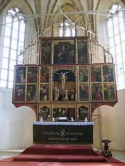 Les stalles du chœur de l’église ont été décrites par l’historien d’art George Oprescu (1881 - 1969) : « Le mobilier est d’espèce rare et très valeureux. Les stalles du chœur, du début du XIVe siècle, sont décorées avec des bandes d’ornements gothiques… C’est la décoration que nous trouvons sur les meubles de ce genre de l’Allemagne et de la Suisse, au rien inférieures à celles-ci, que nous pouvons dire qu’à Biertan on trouve des stalles, travaillées chez nous, par des ébénistes transylvains, qui pourraient figurer dans n’importe quel grand musée d’art appliqué »[4]. La porte de la sacristie est fameuse, elle aussi, par son système très compliqué de 19 serrures, réalisée par les maîtres locaux, en 1515 et qui a déclenché un intérêt exceptionnel, étant primée à l’Exposition Mondiale de Paris de 1900 et qui constitue un exemple représentatif de la manufacture saxonne médiévale. Le système original de fermeture fonctionne aussi bien de nos jours et il est démontré aux touristes. Les fortifications qui entourent l’église sont considérées comme les plus fortes de la Transylvanie, dans un château fort paysan. Ces fortifications ont trois rangées de murailles, 6 tours et 3 bastions construits en plusieurs étapes, depuis le XIVe siècle. Dans la partie supérieure, il y a un couloir de défense, l’horloge et les cloches. La tour « mausolée » est située au nord-est et elle a, au rez-de-chaussée, un mausolée qui abrite, depuis 1913, les tombes des prélats de cette église. Les pierres tombales, de vrais chefs-d’œuvre, ont été réalisées par Nicolaus Elias de Sibiu.