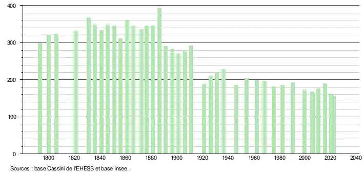L'évolution du nombre d'habitants est connue à travers les recensements de la population effectués dans la commune depuis 1793. Pour les communes de moins de 10 000 habitants, une enquête de recensement portant sur toute la population est réalisée tous les cinq ans, les populations de référence des années intermédiaires étant quant à elles estimées par interpolation ou extrapolation[34]. Pour la commune, le premier recensement exhaustif entrant dans le cadre du nouveau dispositif a été réalisé en 2005[35].