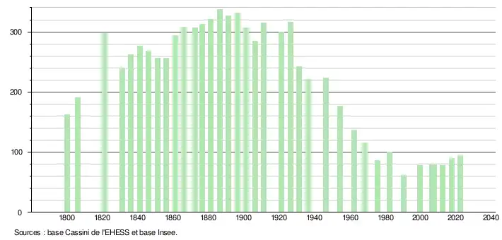 L'évolution du nombre d'habitants est connue à travers les recensements de la population effectués dans la commune depuis 1800. Pour les communes de moins de 10 000 habitants, une enquête de recensement portant sur toute la population est réalisée tous les cinq ans, les populations de référence des années intermédiaires étant quant à elles estimées par interpolation ou extrapolation[14]. Pour la commune, le premier recensement exhaustif entrant dans le cadre du nouveau dispositif a été réalisé en 2007[15].
