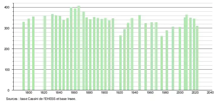 L'évolution du nombre d'habitants est connue à travers les recensements de la population effectués dans la commune depuis 1793. Pour les communes de moins de 10 000 habitants, une enquête de recensement portant sur toute la population est réalisée tous les cinq ans, les populations de référence des années intermédiaires étant quant à elles estimées par interpolation ou extrapolation[33]. Pour la commune, le premier recensement exhaustif entrant dans le cadre du nouveau dispositif a été réalisé en 2008[34].