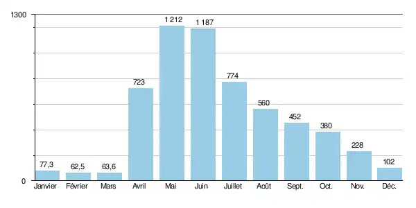 Le débit moyen mensuel observé en février (minimum d'étiage) est de 62,5 m3/s, soit quelque 5 % du débit moyen du mois d'avril (1 212 m3/s), ce qui montre l'amplitude très importante des variations saisonnières. Sur la durée d'observation de 54 ans, le débit mensuel minimal a été de 31,4 m3/s (en ), tandis que le débit mensuel maximal s'élevait à 2 620 m3/s ().
