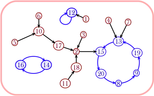 Pour décrire la bijection de Joyal, il est commode d'utiliser une représentation de chaque application ƒ de dans à l'aide d'un graphe orienté dont l'ensemble des sommets est et où les arêtes relient chaque élément à son image par ƒ[3]. Par exemple, pour ƒ = (12, 15, 2, 13, 10, 10, 13, 9, 19, 17, 18, 12, 15, 16, 20, 14, 2, 2, 13, 8), c'est-à-dire pour ƒ(1) = 12, ƒ(2) = 15, ƒ(3) = 2, … on a la représentation graphique ci-contre.