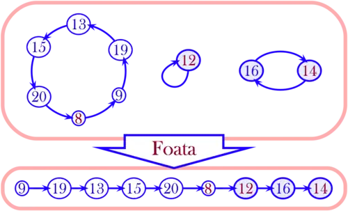 On peut alors appliquer la correspondance de Foata à la restriction de ƒ à C, que nous noterons τ, et obtenir ainsi un arrangement (une suite ordonnée) ω de tous les éléments de C. La correspondance de Foata consiste à écrire la suite des cycles de la décomposition en cycles disjoints de τ, en prenant bien soin :