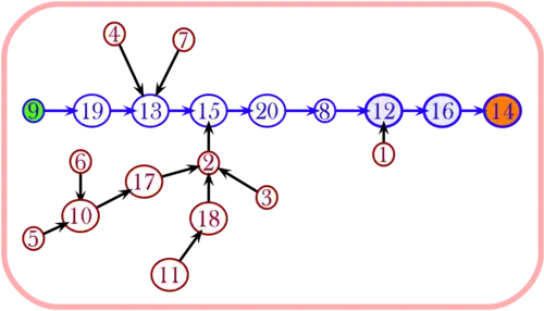 Sur l'exemple ci-contre, x = 9 et y = 14, et le chemin minimal est ω = (9, 19, 13, 15, 20, 8, 12, 16, 14). Les records de la suite renversée (14, 16, 12, 8, 20, 15, 13, 19, 9) sont successivement 14, 12 et 8, ce qui conduit à la décomposition de τ en cycles disjoints :