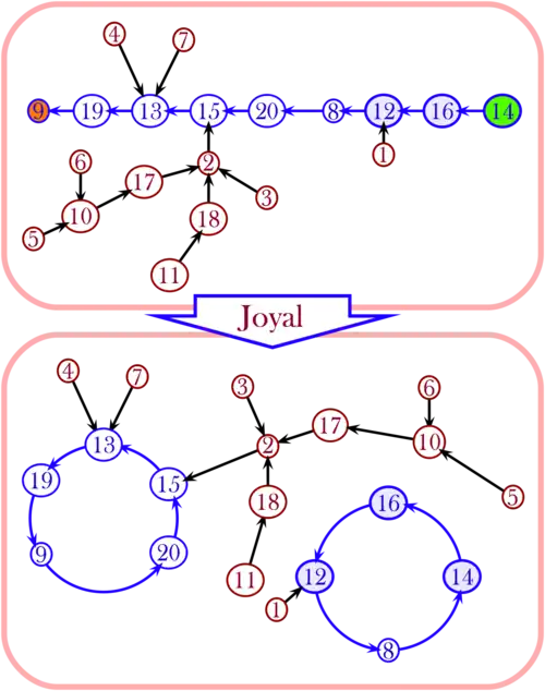 À titre d'exemple, si l'on intervertit les rôles de x et y, on obtient un nouvel élément de Examinons son image réciproque g par la bijection de Joyal : l'ensemble des étiquettes des sommets apparaissant sur le chemin de y à x reste le même, mais la suite η obtenue est la suite inverse de la suite ω observée précédemment. Les records vers le bas de la suite renversée de η (à savoir la suite ω) sont alors 9 puis 8, conduisant à une décomposition en cycles (14, 16, 12, 8) (20, 15, 13, 19, 9) de la partie cyclique de g. On récupère alors, comme attendu, une application g = (12, 15, 2, 13, 10, 10, 13, 14, 20, 17, 18, 8, 19, 16, 13, 12, 2, 2, 9, 15) différente de l'application ƒ qu'on avait au départ (voir ci-dessus).