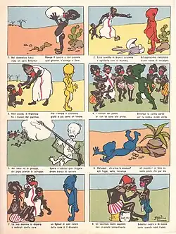 Cette bande dessinée avec le texte sous les cases est arrêtée en 1933, la direction du Corriere estimant qu'un héros noir positif offre un mauvais exemple aux petits lecteurs italiens à une époque où l'Italie fasciste prépare l'annexion de l'Éthiopie[1].
