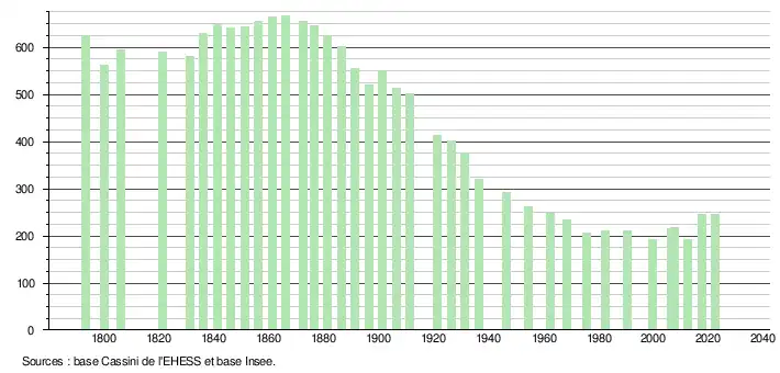 | L'évolution du nombre d'habitants est connue à travers les recensements de la population effectués dans la commune depuis 1793. Pour les communes de moins de 10 000 habitants, une enquête de recensement portant sur toute la population est réalisée tous les cinq ans, les populations de référence des années intermédiaires étant quant à elles estimées par interpolation ou extrapolation[22]. Pour la commune, le premier recensement exhaustif entrant dans le cadre du nouveau dispositif a été réalisé en 2007[23]. En 2022, la commune comptait 246 habitants[Note 3], en évolution de +7,42 % par rapport à 2016 (Corrèze : −0,59 %, France hors Mayotte : +2,11 %). |