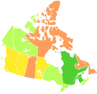Le droit d'utiliser les deux langues officielles varie considérablement dans les législatures et cours de justice au Canada au sein des différents gouvernements (fédéral, provinciaux et territoriaux)[21]. Les droits linguistiques au niveau des lois fédérales sont constants à l'échelle du Canada, mais les provinces et territoires possèdent des politiques linguistiques propres.
