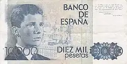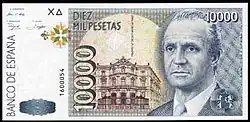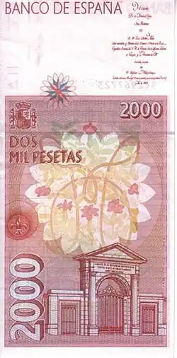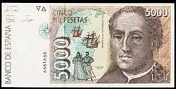 | En 1992, la Banque d'Espagne a publié sa dernière série avant l'introduction de l'Euro. Les billets ont été faits par l'artiste graphique Reinhold Gerstetter et imprimé par la "Fábrica Nacional de Moneda y Timbre". L'objectif de la Banque d'Espagne, la question de cette nouvelle série était de renforcer la sécurité à travers des micro-texte imprimé et indices visible uniquement avec une loupe. Cette série de billets combine des éléments artistiques espagnols et américains pour célébrer en le 500e anniversaire de la découverte de l'Amérique par Christophe Colomb. | ||||||||||||