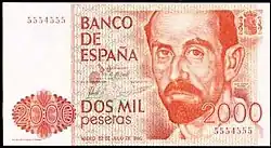 2000 Ptas | 147 × 80 mm | Orange Rouge | Buste de Juan Ramón Jiménez |