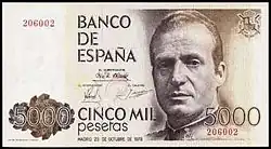5000 Ptas | 156 × 85 mm | Marron | Juan Carlos Ier d'Espagne | Palais royal de Madrid et texte manuscrit extrait du discours du de Juan Carlos Ier : "Para la Corona y para los demás órganos del estado, todas las aspiraciones son legítimas, y todas deben, en beneficio de la comunidad, limitarse recíprocamente" |