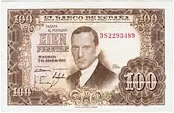 100 Ptas | 127 x 78 mm | Marron | Julio Romero de Torres | La Fuensanta, tableau de Julio Romero de Torres | P-145 | |||||