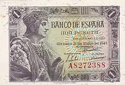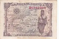 1 Ptas | Marron | Isabelle la Catholique | Femme indienne au premier plan, à l'arrière plan, Carte de la mer des Caraïbes (golfe du Mexique) | P-128 | ||||||
