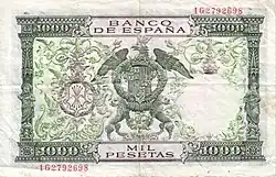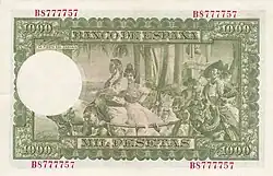 1000 Ptas | 200 x 135 mm | Beige | Deux buste de femmes, allégories du commerce et de l'Espagne | P-10 | ||||||