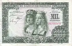 1000 Ptas | 145 × 90 mm | Vert | Portrait d'Isabelle et Ferdinand, les rois catholiques signé de Juan Antonio Morales | La grille de la porte de la chapelle royale de Grenade[2] | P-149 | |||||