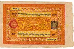 Les premiers billets de banque sont mis en circulation en 1912 après la déclaration d'indépendance. Thubten Gyatso met en place une réserve d'or, ayant valeur de garantie, afin d'engager l'émission de papier monnaie. En 1925, la première banque tibétaine entreposera trois cents lingots à Lhassa dans le palais du Potala[2].